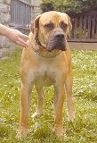 | Požadavky HBKS k registraci boerboela - standard 1. Celkový vzhled boerboela Boerboel je velký pes typu mastiffa, robustní, houževnatý a s hladkou srstí. Třebaže boerboel by měl být silných končetin a svalnatý, měl by být současně pohyblivý a v v pohybu živý. Boerboel by nikdy neměl působit nohatě, ale ani nesmí mít příliš krátké končetiny. Celkový vzhled boerboela by mu měl dovolovat dosahovat nejvyššího výkonu a síly spolu s dlouhým krokem plně odpovídajícím délce trupu. Hlavním kritériem hodnocení boerboela není hmotnost, ale důležitá je jeho vhodnost k pracovním účelům, jeho velikost a konstituce - pes musí harmonicky odpovídat hlavním požadavkům. Přednost se dává psům o hmotnosti přesahující 50 kg (112 liber) a ideální hmotnost činí přibližně 65 kilogramů (146 liber). Pozn.: staré jizvy a úrazy způsobené při práci nebo nehodách nejsou žádoucí. STANDARD HBSA PLEMENE BOERBOEL - BÚRSKÝ BULDOK HISTORIE Boerboel je velký, silný a inteligentní pracovní pes, který se v Jižní Africe chová již od 17. století. K vývoji plemene přispěli různí psi typu mastiffa z Evropy i velcí psi z Afriky. Typický vzhled boerboelů se velmi podobá vzhledu asyrských psů v období zhruba 700 let před Kristem. CELKOVÝ VZHLED BOERBOELA Boerboel je velký a silný pes, dobře vyvážených proporcí, s dobře vyvinutým osvalením a hbitých pohybů. Tento pes by měl být impozantní a imponující. Psi působí výrazně samčím dojmem a feny samičím dojmem. ![]() VYVÁŽENOST BOERBOELA Boerboel je dokonale vyvážený pes - všechny části jeho těla by měly být v dokonalé rovnováze. TEMPERAMENT A CHARAKTERISTIKA BOERBOELA Boerboel je spolehlivý, poslušný a inteligentní pes se silně rozvinutými instinkty hlídacího psa. Je sebevědomý a neohrožený, ale respektuje potřeby rodiny. (to je ten nalevo...) HLAVA BOERBOELA Hlava boerboela je nejdůležitější vlastností boerboela, protože reprezentuje jeho celý charakter. Hlava je krátká, široká, hluboká, čtvercová a svalnatá s dobře vyplněnými lícemi. Část mezi očima musí být dobře vyplněná. HORNÍ LINIE HLAVY / TEMENO Horní část hlavy je široká a plochá s plasticky vystupujícími svaly. OBLIČEJOVÁ ČÁST HLAVY BOERBOELA Obličejová část hlavy by měla harmonicky ladit s celkovým vzhledem hlavy a může být s černou maskou nebo bez ní. STOP Stop by měl být patrný, ale ne přehnaně výrazný. ČENICH BOERBOELA Čenich je černý s velkými nozdrami, jež jsou široce otevřené. NOSNÍ KOST Nosní kost je rovná a rovnoběžná s horní linií hlavy. Je hluboká, široká a lehce se zužuje směrem kupředu. Nosní kost by měla být dlouhá 8 - 10 cm. PYSKY Horní pysk je volný a masitý a neměl by přesahovat přes dolní čelist. Horní pysk (pod čenichem) by měl překrývat dolní pysk. ČELISTI BOERBOELA Dolní čelist je silná, hluboká a široká a lehce se zužuje směrem dopředu. ZUBY BOERBOELA Zuby by měly být bílé, dobře vyvinuté a ve správných rozestupech; kompletní sada zubů (42 zubů); skus by měl být nůžkový. OČI BOERBOELA Barva očí může být v jakémkoliv odstínu hnědé, ale tmavší než srst. Oči by měly být nasazeny vodorovně. Měly by být široce posazené s těsně přiléhajícími a dobře pigmentovanými víčky. UŠI BOERBOELA Uši by měly být středně velké, ve tvaru V a měly by být v dobrém poměru s hlavou. Jsou nasazeny vysoko a posazeny široce na hlavě. Je-li vzbuzen zájem psa, uši by měly tvořit přímou linii s horní částí hlavy. KRK BOERBOELA: PROFIL: Šíje vykazuje křivku se silným osvalením a je nasazena vysoko na plece. DÉLKA: Krk je středně dlouhý a v dobrém poměru k celkové stavbě těla psa. VZHLED: Krk je poměrně silný a svalnatý, pevně připojený k hlavě a postupně se rozšiřuje k místu, kde je napojen na plece. Krk, hlava a plece tvoří jeden celek. KŮŽE NA KRKU: Kůže na hrdle je volná a mezi předními končetinami těsně přiléhá. TRUP BOERBOELA: Trup se směrem k bedrům lehce zužuje. HORNÍ LINIE: Horní linie by měla být rovná. HŘBET: Hřbet je rovný, široký a v dobrém poměru se stavbou těla, s vystupujícími zádovými svaly a krátkými bedry. ZÁĎ: Záď je široká a silná s dobře vyvinutými svaly. HRUDNÍK: Hrudník je svalnatý a silný. Hrudník by měl být široký a hluboko posazený mezi hrudními končetinami s dobře klenutými žebry. Hrudní koš by měl být v dobrém poměru s hrudí. OCAS: Ocas je nasazen vysoko. Měl by být rovný a přednost se dává kupírovanému ocasu (tři obratle). Dlouhé ocasy jsou přijatelné. HRUDNÍ KONČETINY: Hrudní končetiny jsou silné, svalnaté a v dobrém poměru k celkové stavbě těla psa. ![]() PLECE / KOHOUTEK: Kohoutek je dobře napojen, plece správně úhlené a s dobře vyvinutými svaly. NADLOKTÍ: Nadloktí by mělo mít dobře vyvinuté svalstvo. HRUDNÍ KONČETINY: Hrudní končetiny by měly být silné, pevné a svalnaté a měly by být postaveny dokonale svisle. PŘEDNÍ NADPRSTÍ: Přední nadprstí je krátké, silné a je postaveno ve svislém prodloužení hrudních končetin a kloubu zápěstí. TLAPY HRUDNÍCH KONČETIN: Tlapy hrudních končetin jsou velké, s dobře vyvinutými polštářky a silnými, tmavými a zahnutými drápy. Tlapy by měly směřovat přímo kupředu. PÁNEVNÍ KONČETINY: Pánevní končetiny jsou silné, pevné a v dobrém poměru k celkové stavbě těla psa; jsou schopny poskytovat psovi silný posun vpřed. STEHNA: Stehna jsou široká, hluboká, dobře vyvinutá s plasticky vystupujícími svaly. LÝTKA / HOLENĚ: Lýtka jsou dobře vyvinutá s plasticky vystupujícími svaly. KOLENA: Kolena jsou silná, pevná a správně úhlená. HLEZNA: Hlezna jsou pevná se správným zaúhlením. NÁRTY: Nárty jsou poměrně krátké, silné a pevné. N
